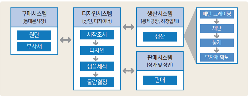 동대문의 의류시스템은 크게 구매 → 디자인 → 생산+판매의 4단계 가치사슬로 구성되며, 이 생태계는 기본적으로 도·소매 점포-디자이너-하청 생산 단계별 행위자들이 ‘단골’이라는 신뢰 네트워크로 묶여서 운영된다. 그리고 ‘지게삼촌’이라 불리는 운반업자가 배달하는 물건을 점포가 받고, ‘사입 삼촌’이라고 불리는 중간 구매대행업자가 동대문 점포와 전국 소매상 사이에서 수요와 공급을 역동적으로 매개한다. 구매는 점포주 및 디자이너가 동대문 종합시장 등에서 원단과 부자재를 구매하는 단계이고, 디자인은 점포주 및 디자이너가 시장조사, 디자인을 하여 샘플제작 후 물량을 결정하는 단계이다. 이렇게 결정된 상품은 자체 공장이나 하청공장을 통하여 생산되고, 점포에서 판매된다. 디지털 기술은 바로 이러한 동대문 특유의 생산-유통체제 곳곳에 적용되면서 새로운 혁신과 부가가치를 창출하고 있는 것이다.