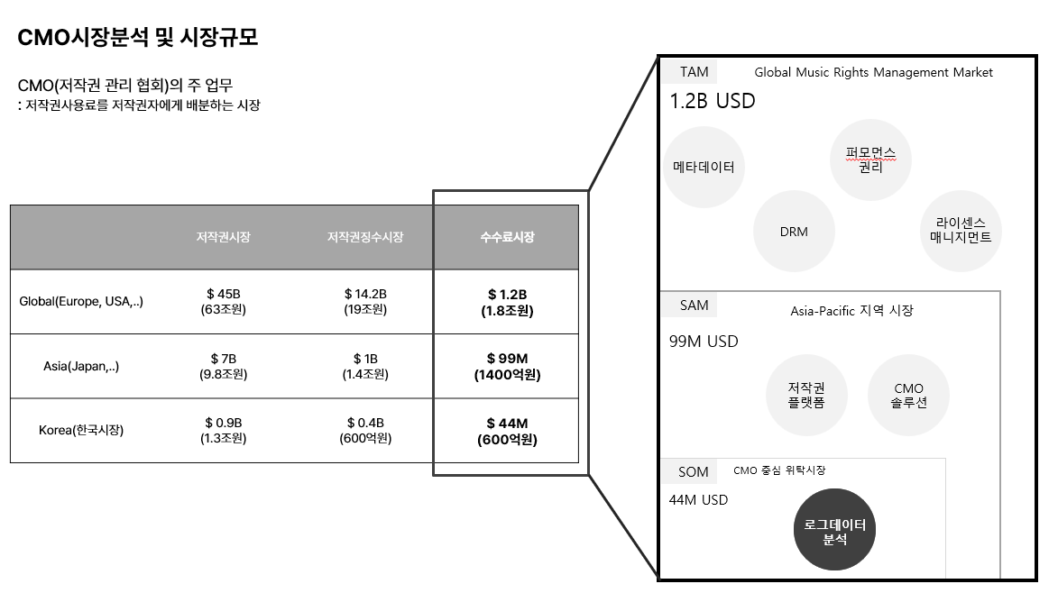 해외는 로그데이터, 디지털큐시트, 음원DNA, AI기반 변형음악 탐지, 음악저작권 관리 플랫폼 같은 기술기반 서비스들이 등장했지만, 우리나라는 기술을 상용화하기에는 수요시장이 너무 작아서 발전할 수 없었다. 실제로 한국음악저작권협회가 거의 유일한 수요자이다.